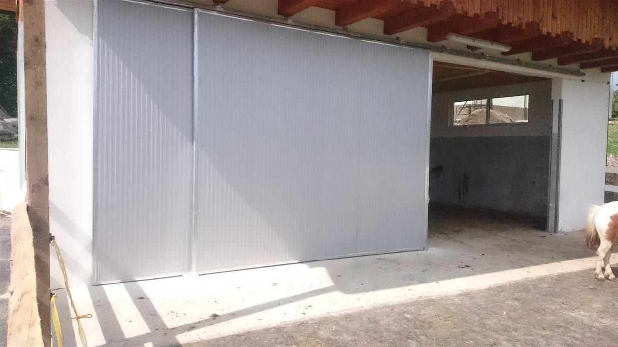 Izdelujemo drsna vrata za zapiranje skladišč, hlevov in drugih prostorov, kjer potrebujete zaščito prostora. Možnost izbire debeline panelov in barve pločevine glede na vaše potrebe.